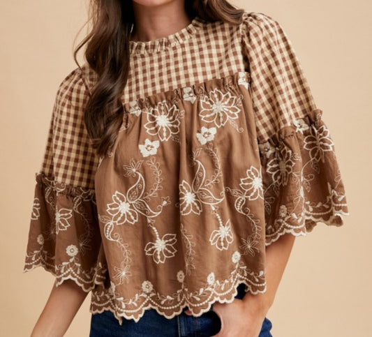 Over Coffee Chats Floral Embroidery Gingham Blouse