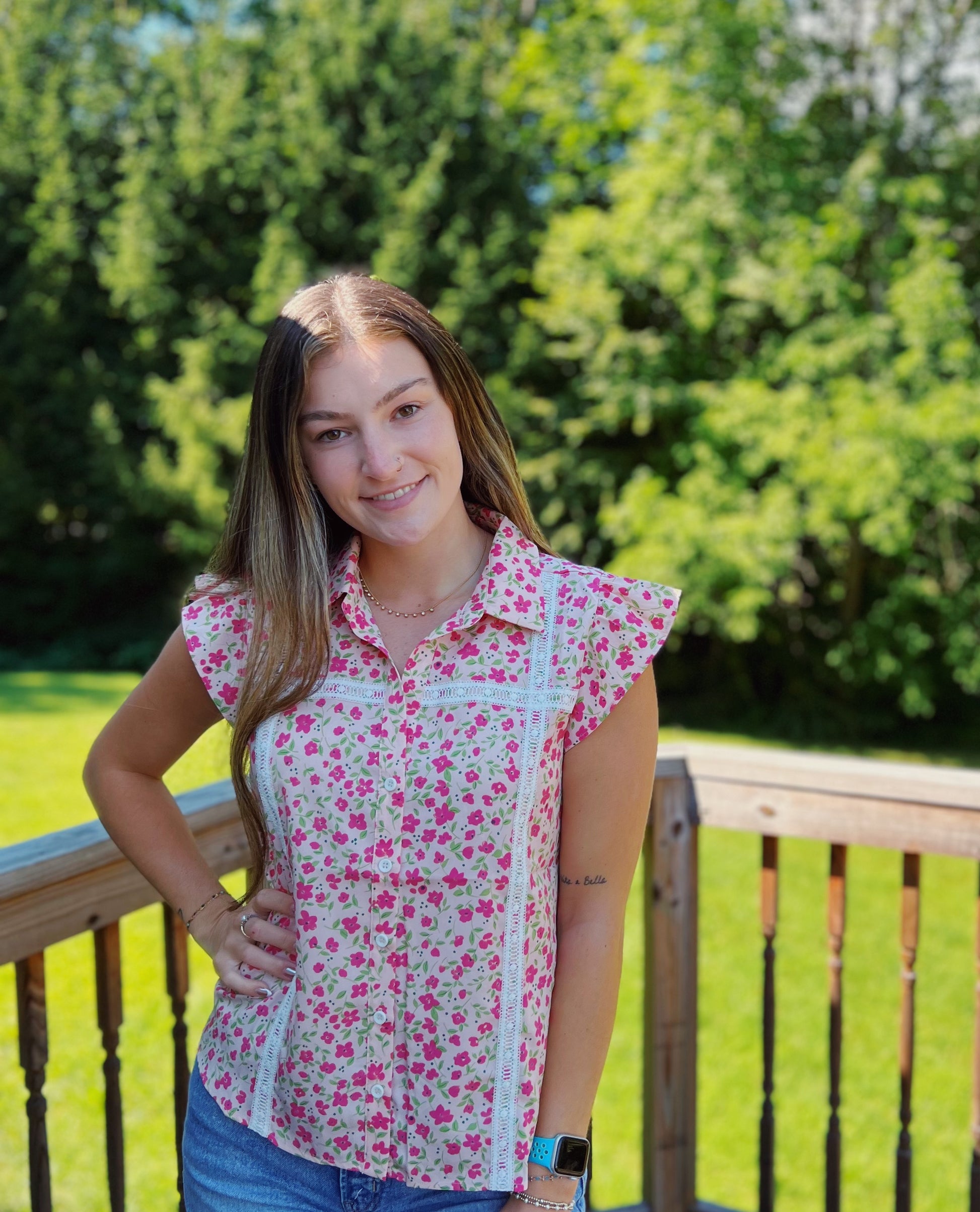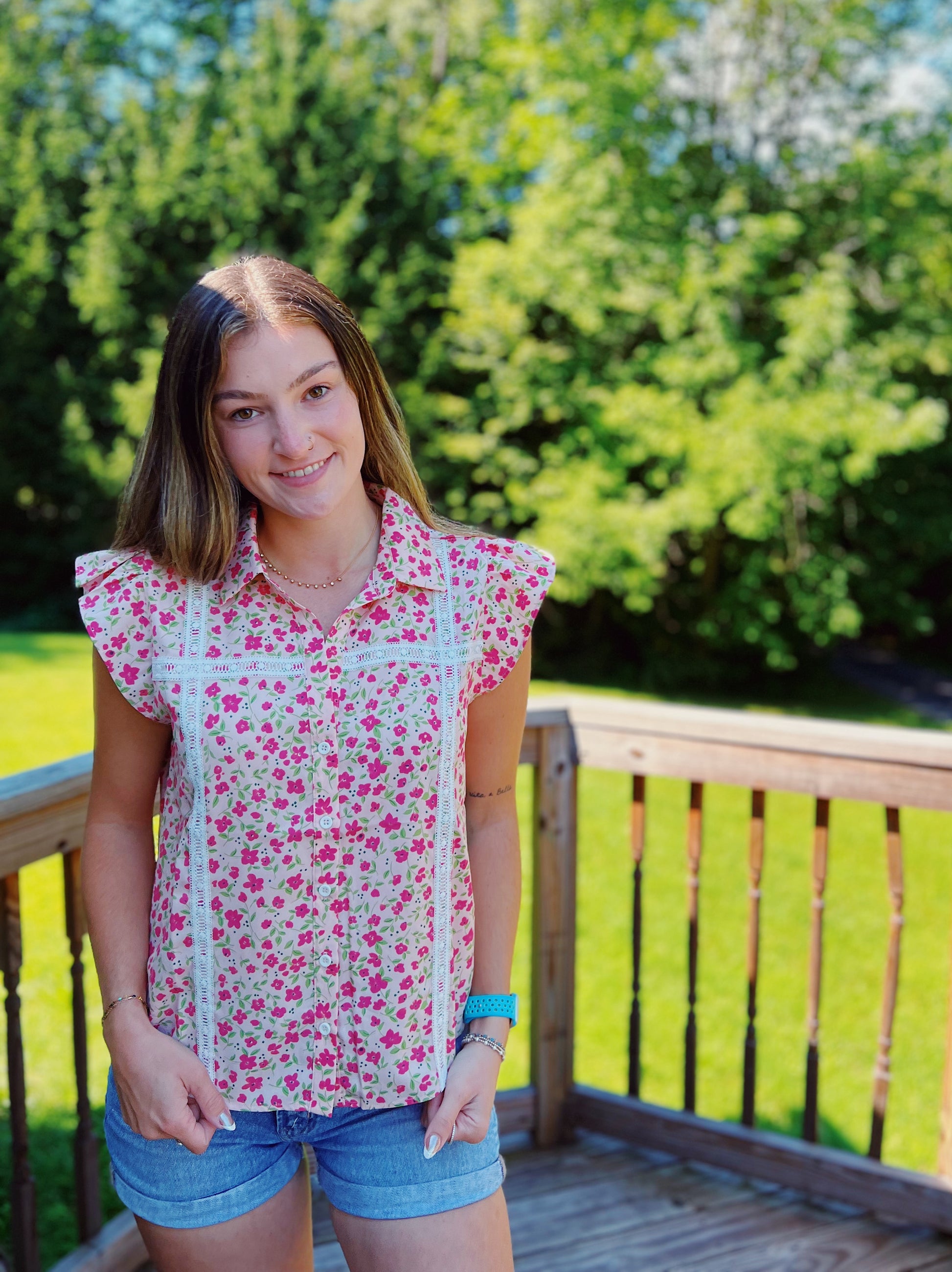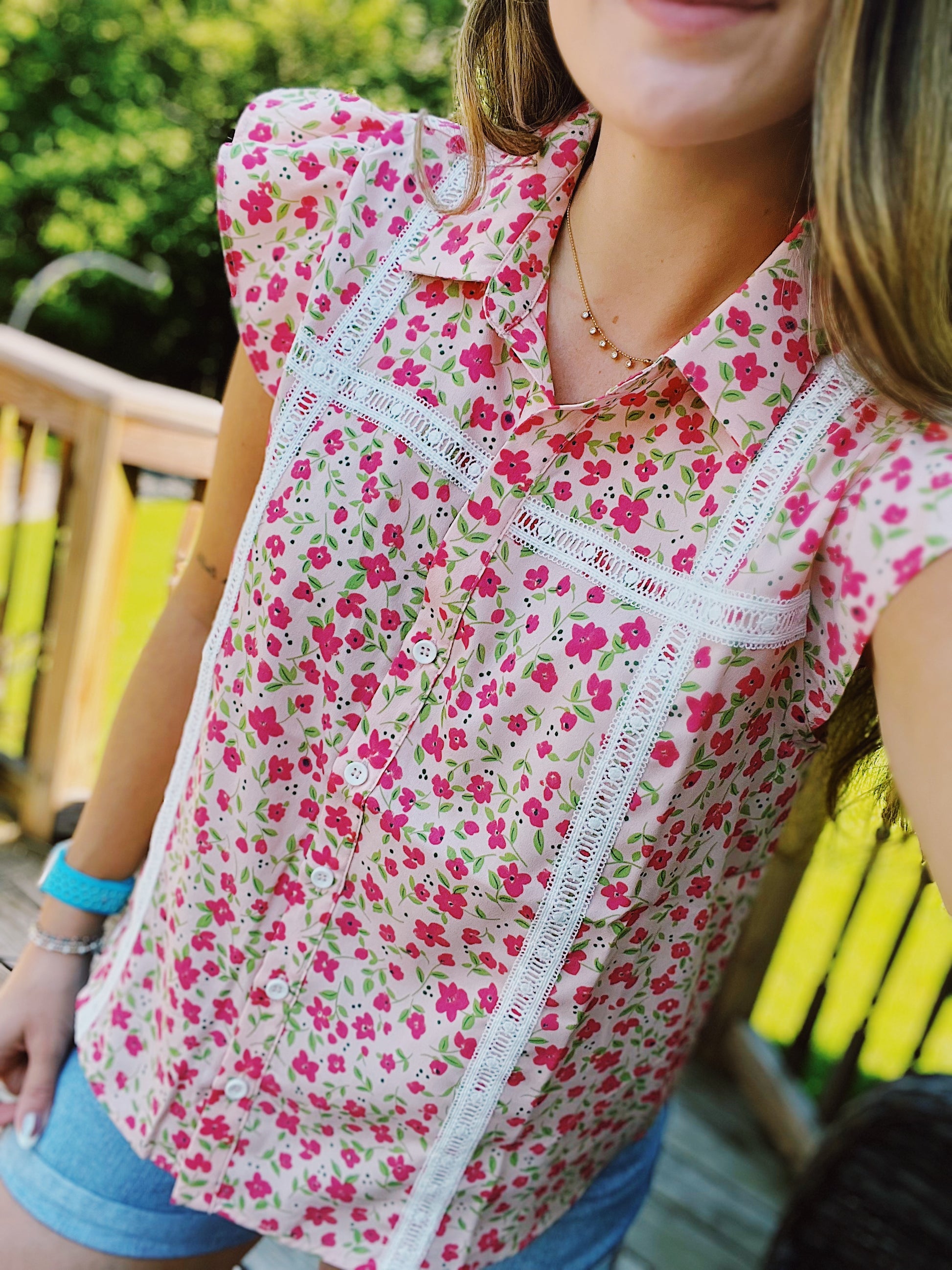 Field of Flowers Pink Floral Lace Trim Blouse