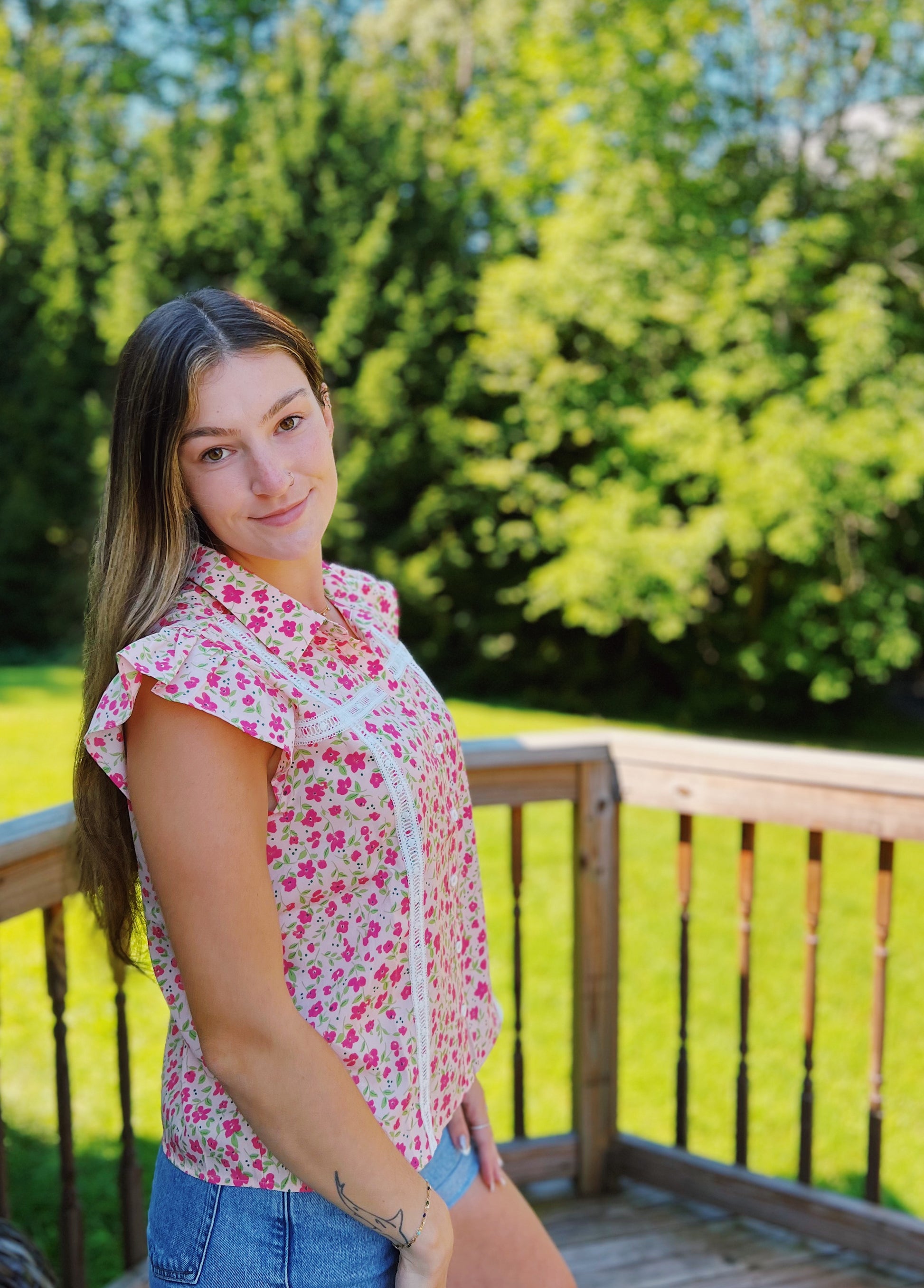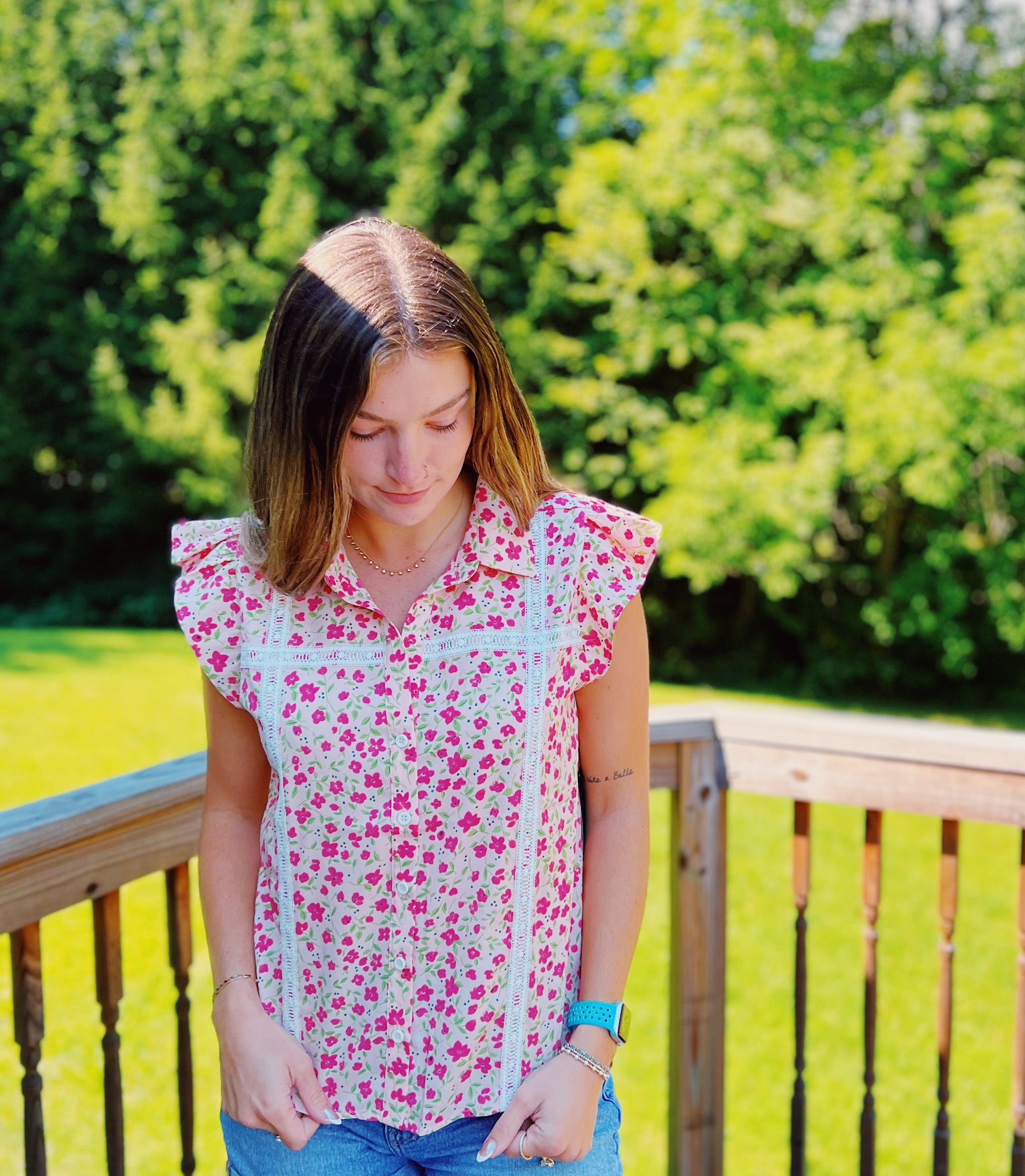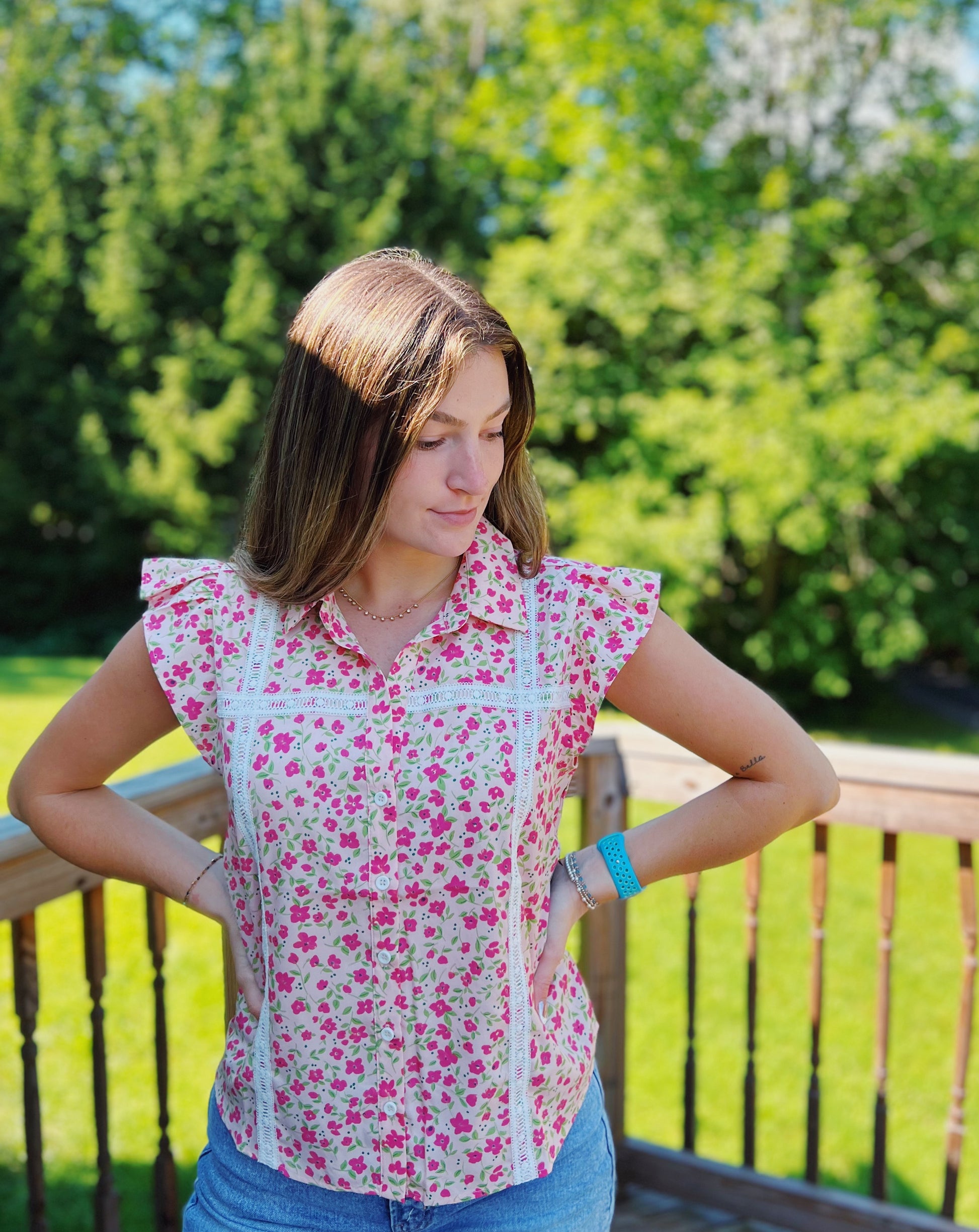 Field of Flowers Pink Floral Lace Trim Blouse