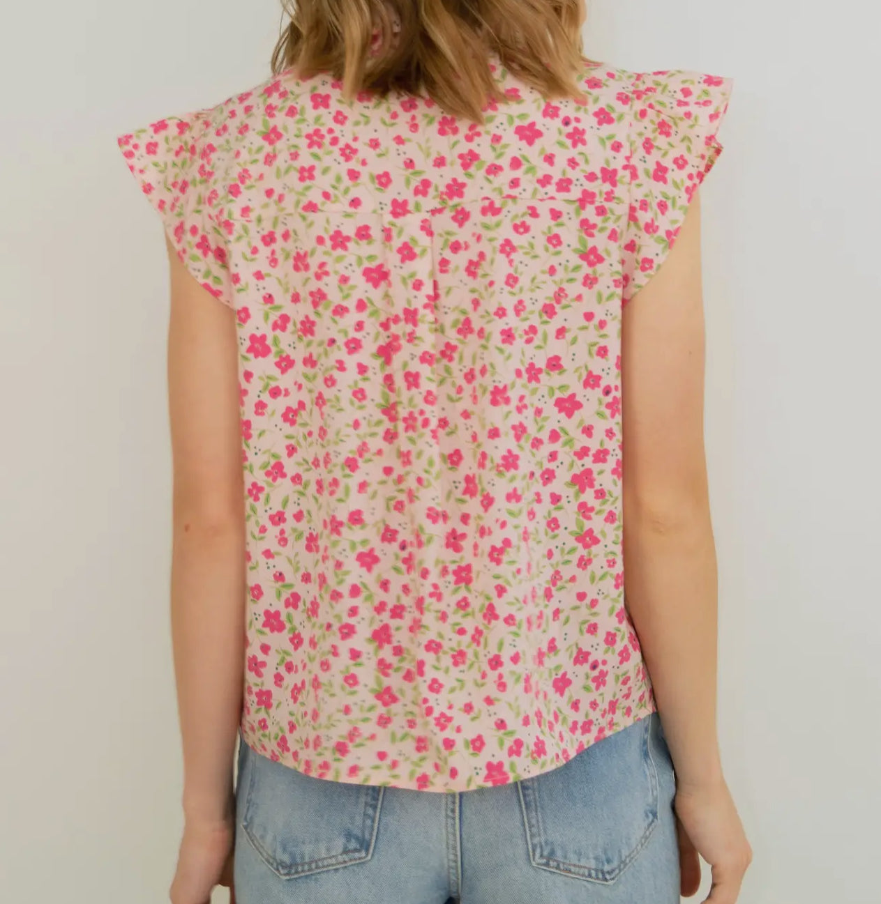 A floral print woven blouse with button front closure and lace trim details. Flared ruffle sleeves for a perfect touch