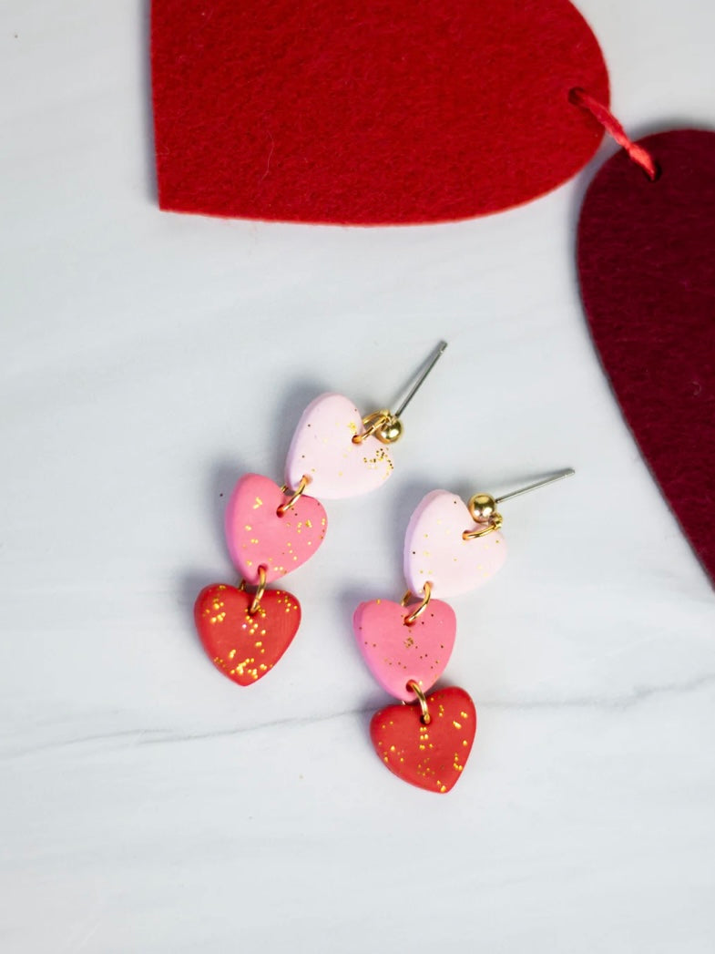 Valentines Golden Sparkles Heart Trio Dangle Earrings
